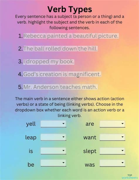 Some of the worksheets displayed are types of verbs, 7 types of verb in english with examples, verbs types. Web verbs worksheet is a great way to help kids in understanding the various forms of verbs. Here we are going to introduce the 3 main.