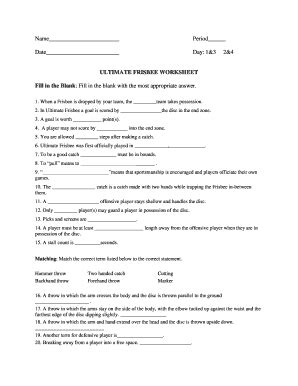 The quiz and worksheet can help test your understanding of playing ultimate frisbee. Web pe ultimate frisbee worksheet history of ultimate frisbee invented by joel sliver_____ and a group of high school students in maplewood_____, new jersey_____, in 1967__. Web complete every fillable field.